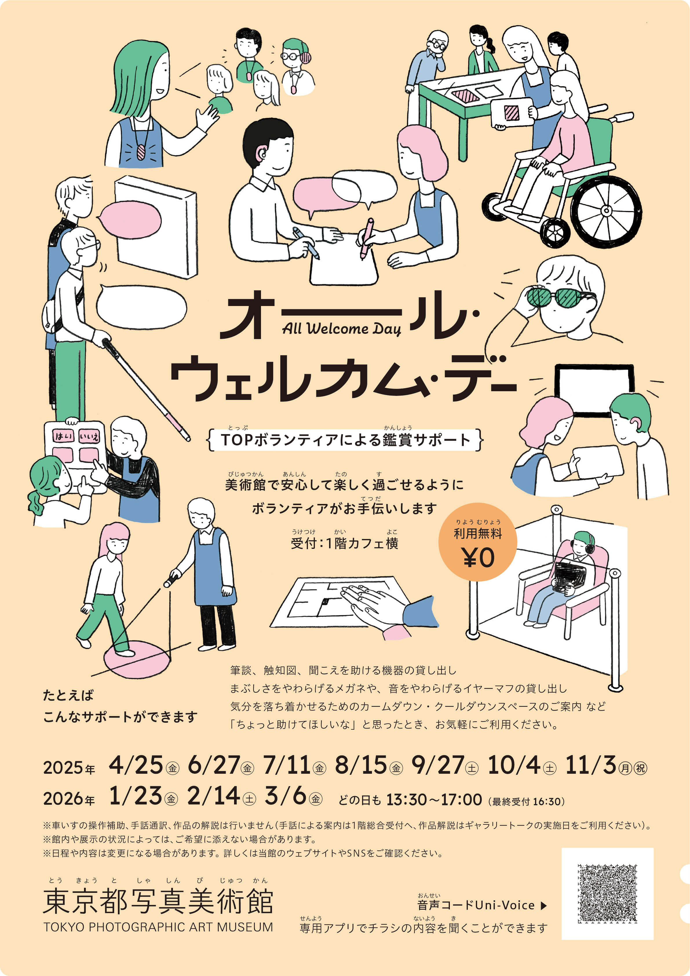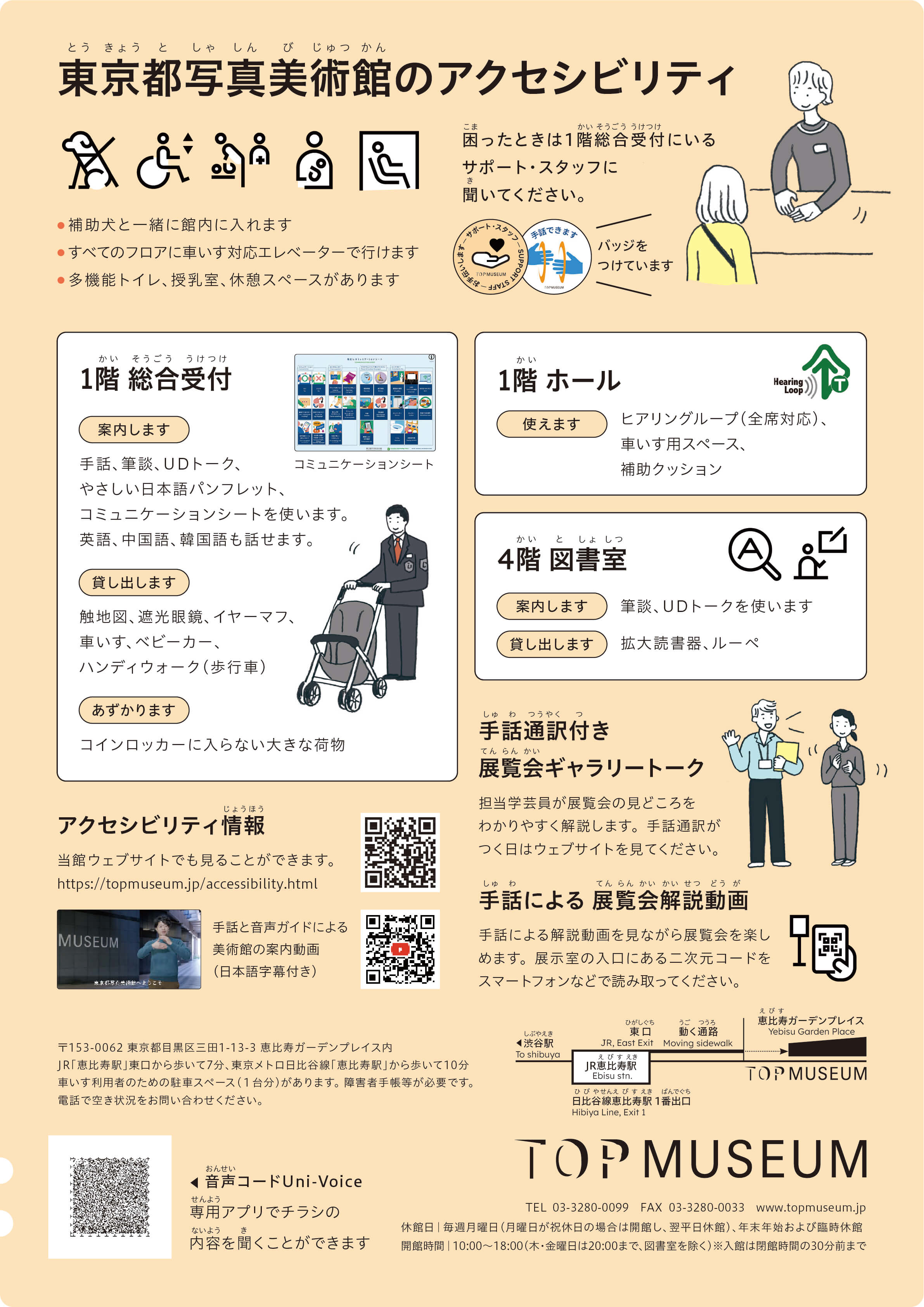 ・まずは受付時にご相談ください。館内、展示内容、設備、スタッフの状況によっては、すべてのご要望に対応できない場合がありますのでご了承ください。・車いす操作等の介助、手話、作品解説は行いません。手話でのご案内は1階総合受付へ、作品の解説はギャラリートーク実施日をご利用ください。詳細はこちら(手話通訳付きギャラリートークページ)
