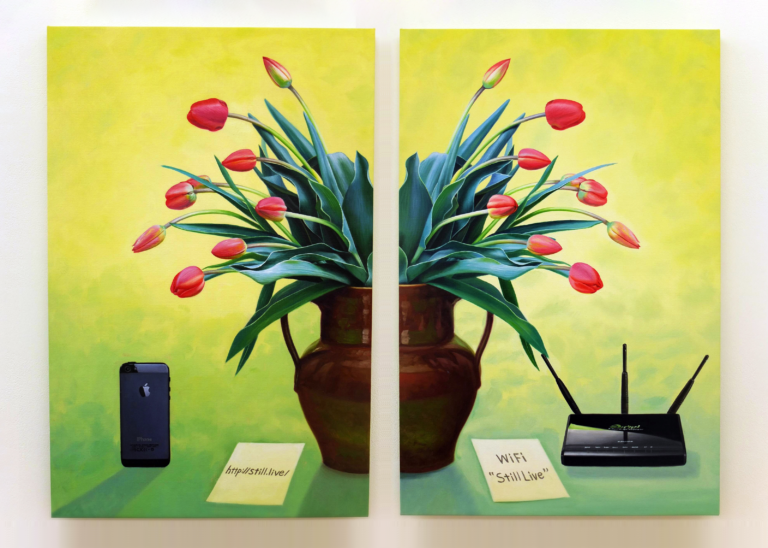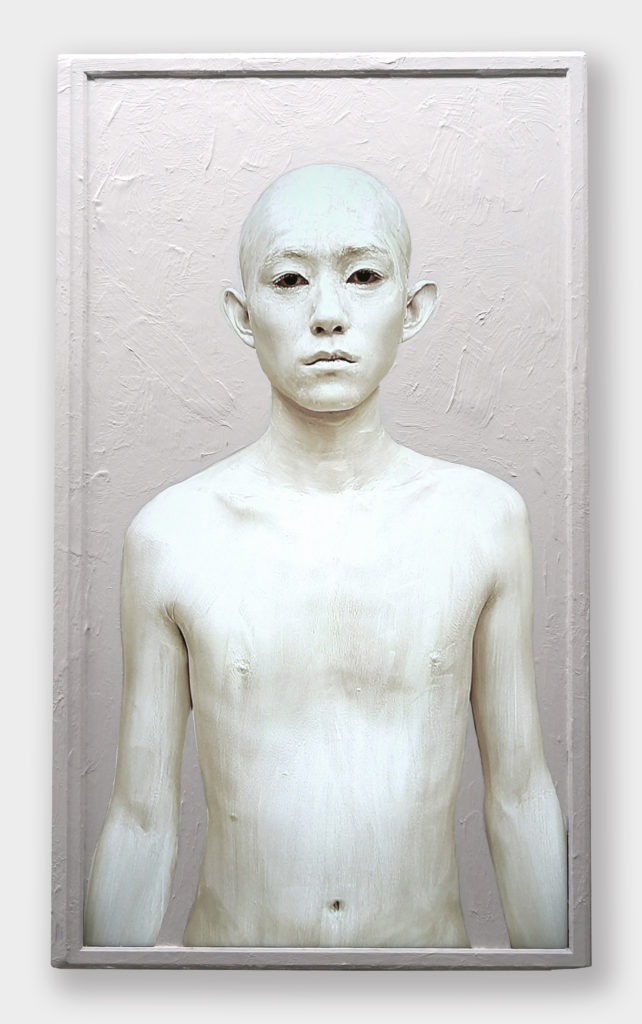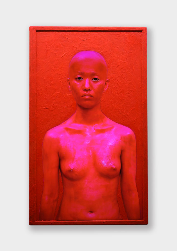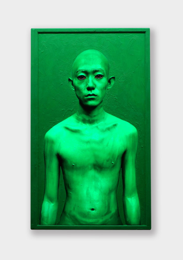 This extended video work started from the question, "What does body painting mean in this age where we always carry smartphones around with us and have acquired a body that is constantly connected to the Internet?" and was inspired by the answer, "We need to paint our information devices as well." First, a person is videoed in a painted state, and then the rest of the monitor showing the image is painted in the same color to complete the body painting. This piece, which was created based on such a concept, produced a strange visual effect that was initially not expected. It was indistinguishable from both video and painting when actually seen. It was first exhibited as part of an installation at the Nara Prefectural Museum of Art's "The Great Kojiki Exhibition," but was later developed as a stand-alone piece.