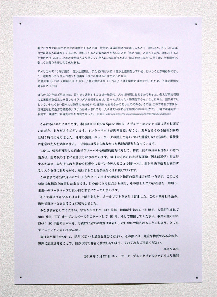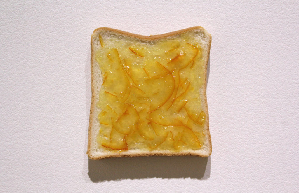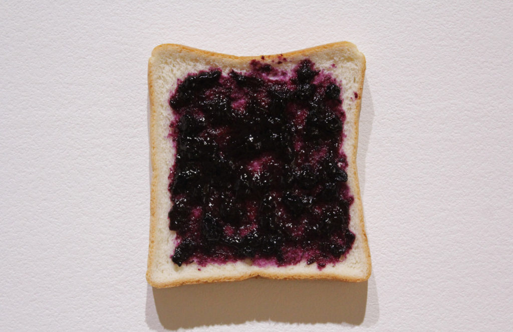In 2016, HEAVY BODY PAINT's transportation to be exhibited at the NTT ICC Open Space turned out to be too late for the opening, so three pieces of bread were hastily displayed where the work was to be exhibited. Their surfaces were covered with marmalade, peanut butter, and blueberry jam, and the colors of each were matched with the HEAVY BODY PAINT that would later be exhibited in the same position. A long excuse for being late was printed on A4 paper and displayed along with the bread. It was inspired by the classic tardiness scene depicted in anime and manga, where the main character runs to school with a loaf of bread in its mouth. It was later recreated when another piece failed to arrive in time at the art book fair, Transbooks.