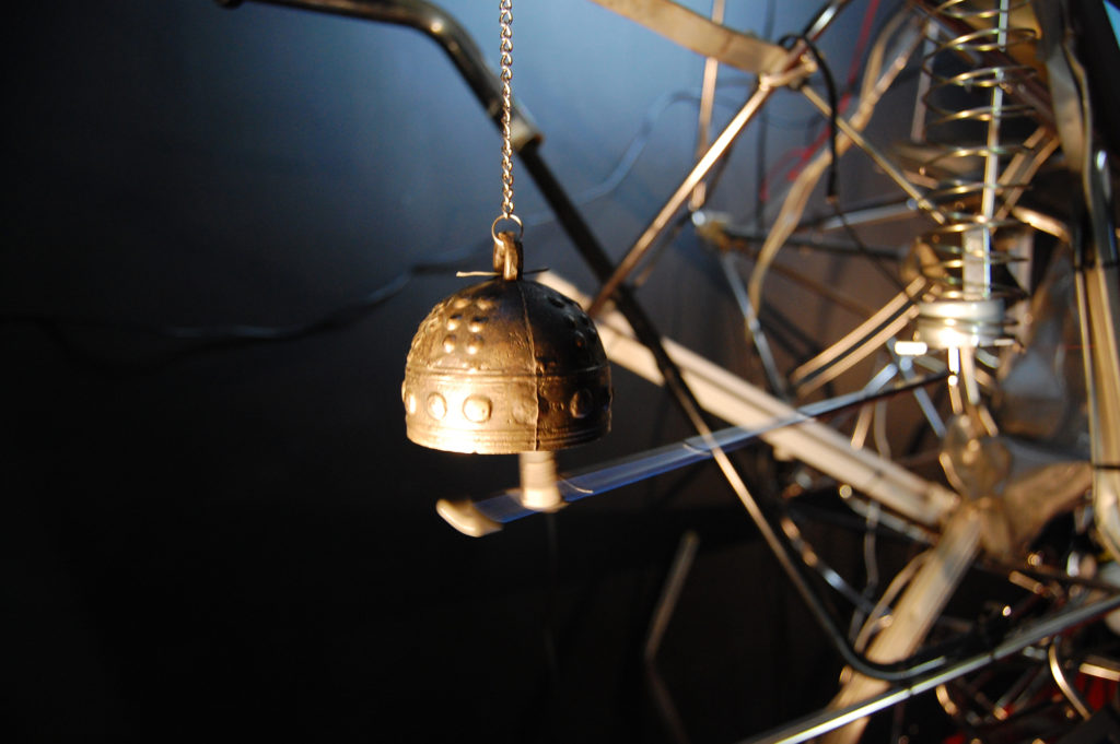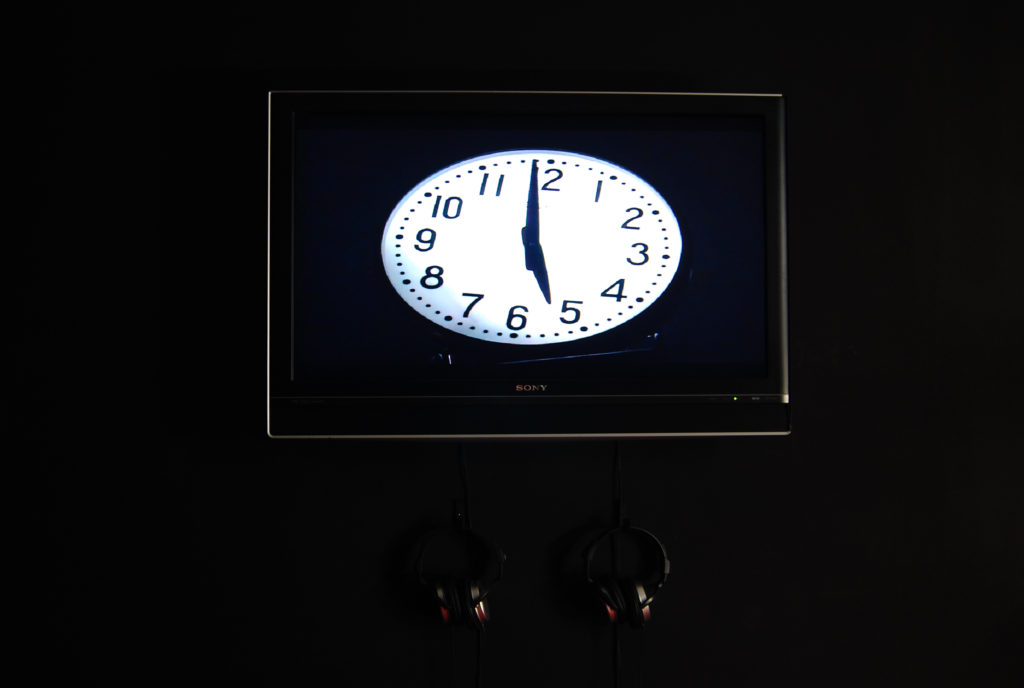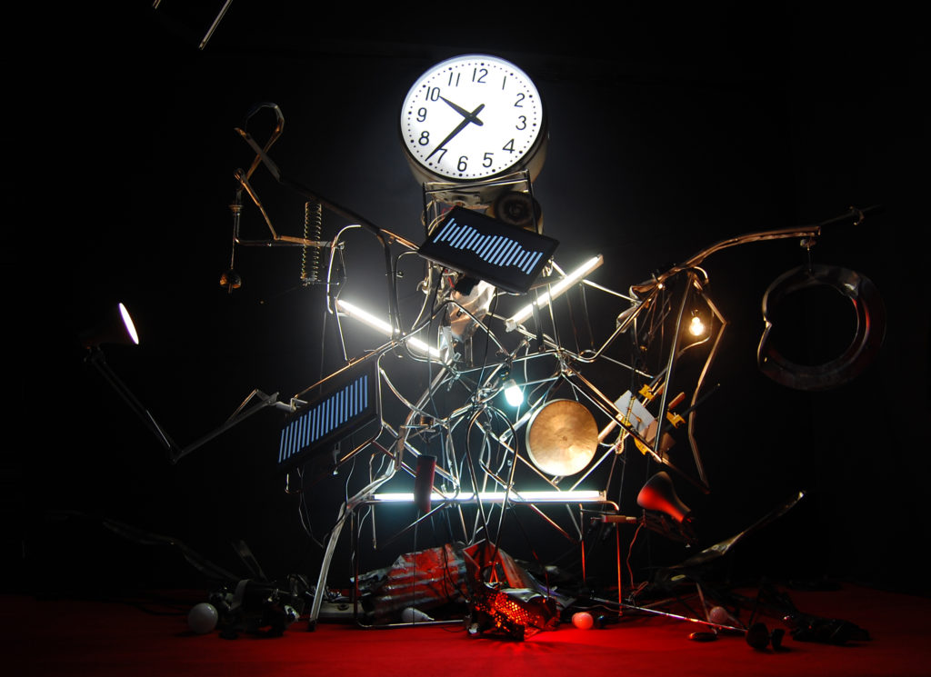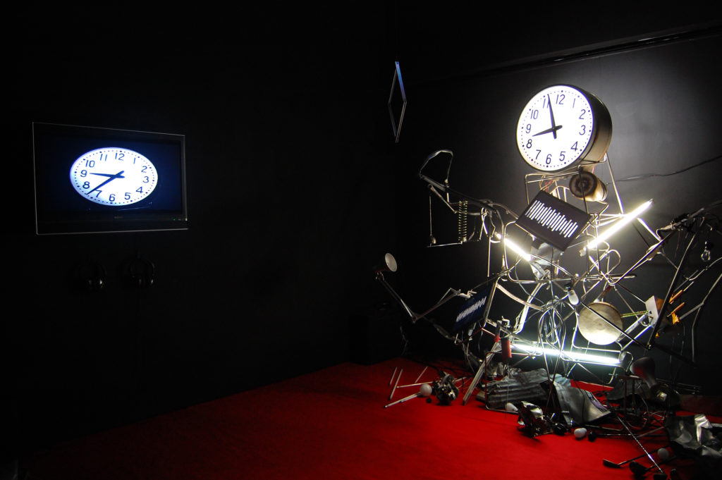 An installation made out of scrapwood objects and other materials, with clock hands moving back and forth. LCD screens, motors, and fluorescent lights are fixed in scrapwood piles and move randomly from time to time, emitting light and sound. On the other side of the kinetic object, a camera is installed, and the captured images are edited in real-time on a computer, and the hands of a clock that moves back and forth are rotated in the correct order and projected onto a monitor screen in the same space. It is an installation that contrasts real space and information space, with the information space having a more orderly structure than the real space, and the real space left in an incoherent state. The structure is the opposite of exonemo's early work FragMental Storm.