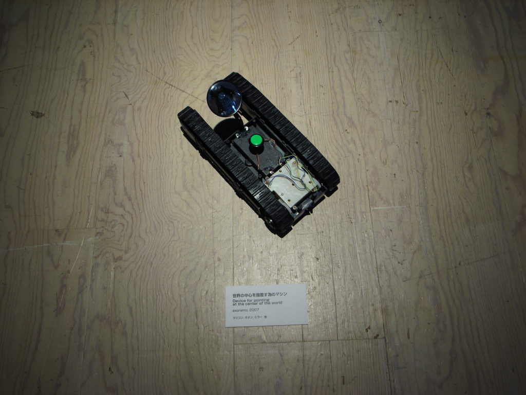 A kinetic piece made out of the caterpillar part of a radio-controlled tank. A big red button is attached to the upper center of the caterpillar. The left and right caterpillars rotate in opposite directions by pushing the button, making it spin around the spot where the finger is pointed. It implies that the center of the world is the place where you point your finger.