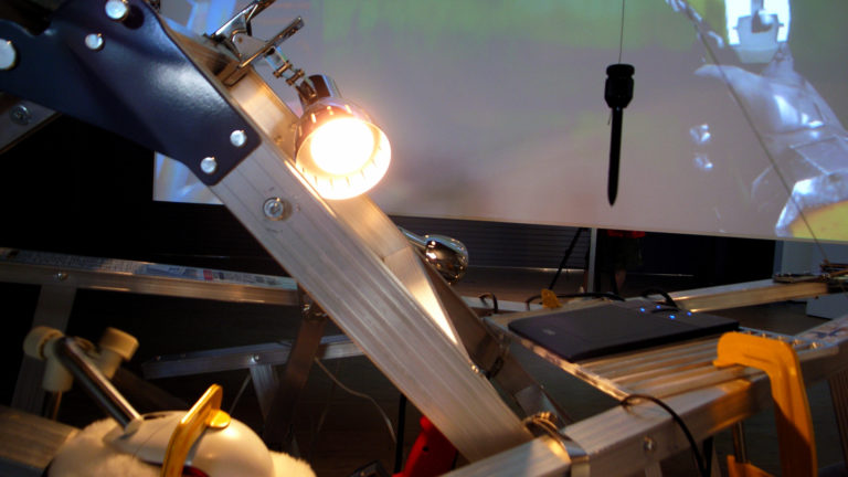 A kinetic piece made out of the caterpillar part of a radio-controlled tank. A big red button is attached to the upper center of the caterpillar. The left and right caterpillars rotate in opposite directions by pushing the button, making it spin around the spot where the finger is pointed. It implies that the center of the world is the place where you point your finger.