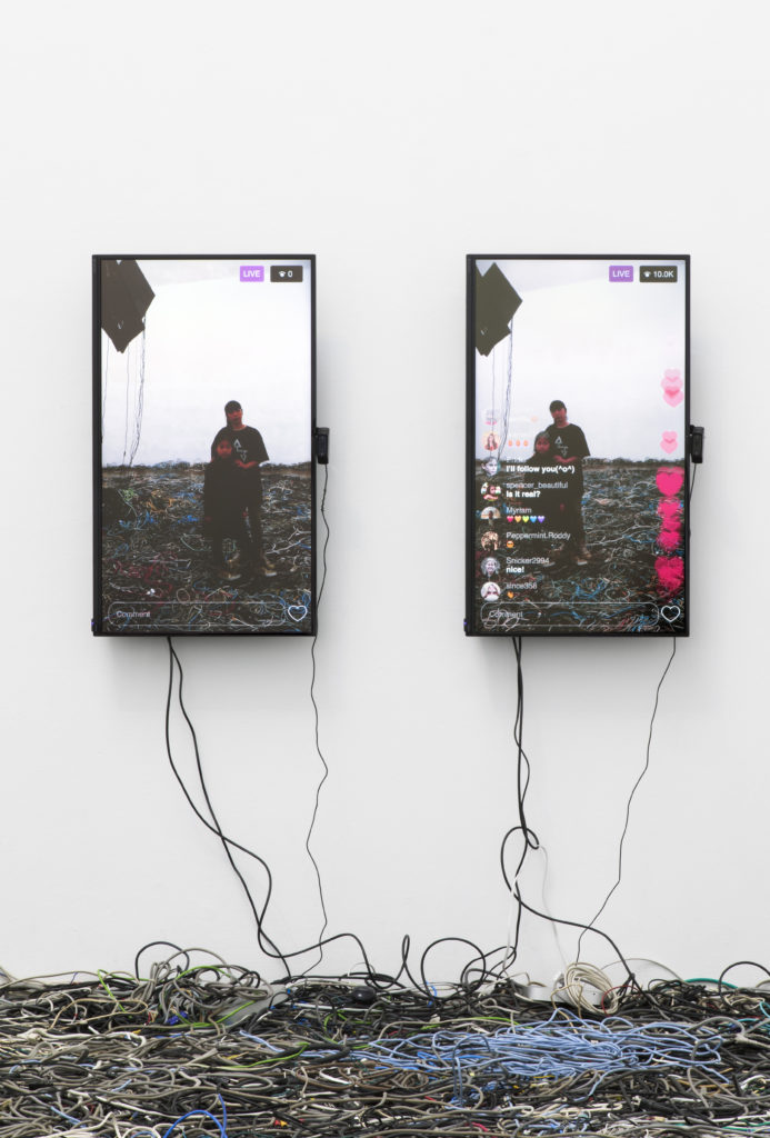 An installation consisting of two monitors showing screens that mimic Instagram's Live stream. The inputs from cameras attached to the side of each monitor are captured on the screens. When visitors stand in front of the piece, they see their own image on the screens, and a large number of viewers, comments, and likes appear on one of the monitors. In contrast, the other monitor shows 0 viewers, 0 comments, and 0 likes, and there is no response at all, and only the interface is comparing the two completely different screens. After social media, modern people are becoming more and more sensitive to others' responses, so this project is meant to confirm the interface's influence on people's emotions.