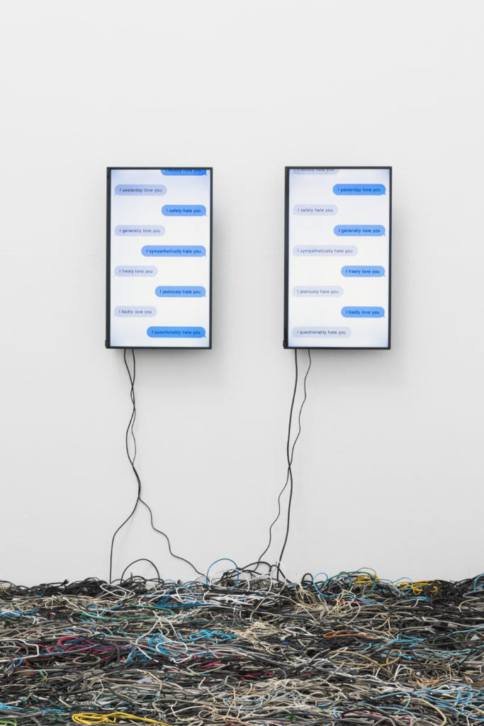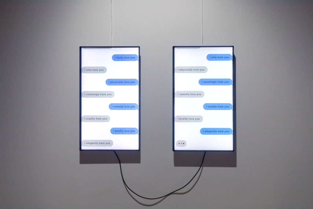 This work shows a conversation on a messaging app, an endless exchange of the sentences: “I [adverb] love you” and “I [adverb] hate you.” The adverbs are selected randomly from 300 or so options, and some of the generated expressions barely make enough sense, while others result in uncommon or awkward wording. The monitors are set up such that its interlocutors express the opposite emotions to the interlocutors on the corresponding side of the other monitor. The work shows up the contrast between the strong human emotions represented by the words “love” and “hate,” and the impersonal processes by which machines process that information.