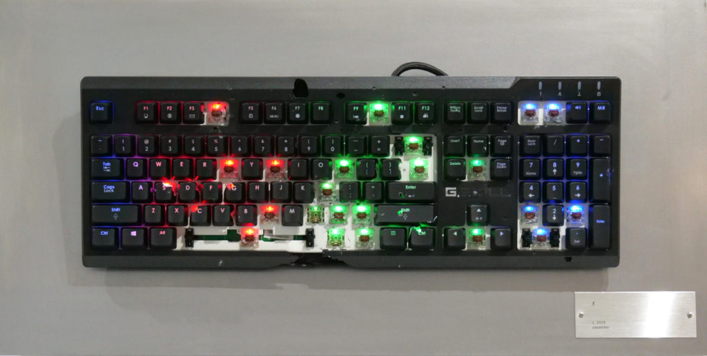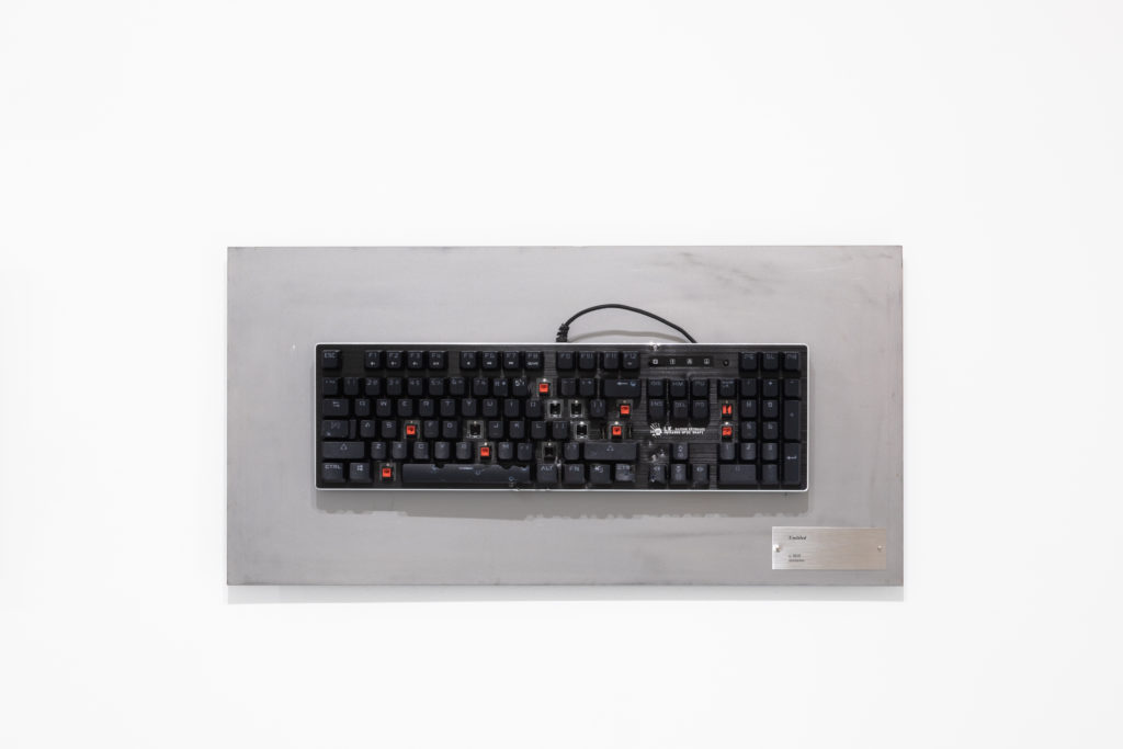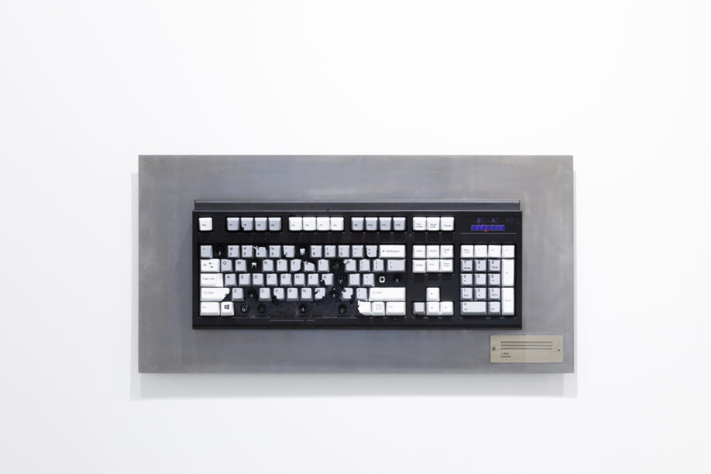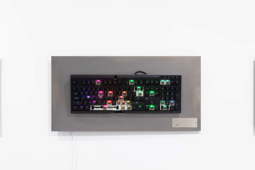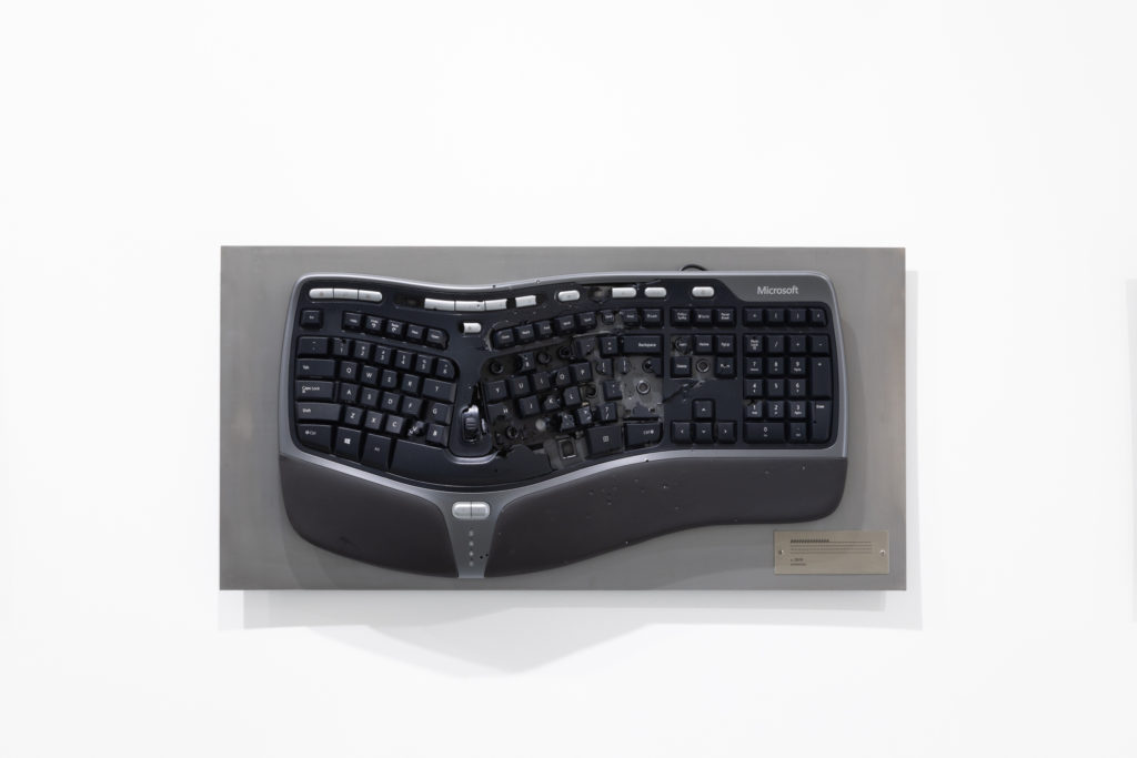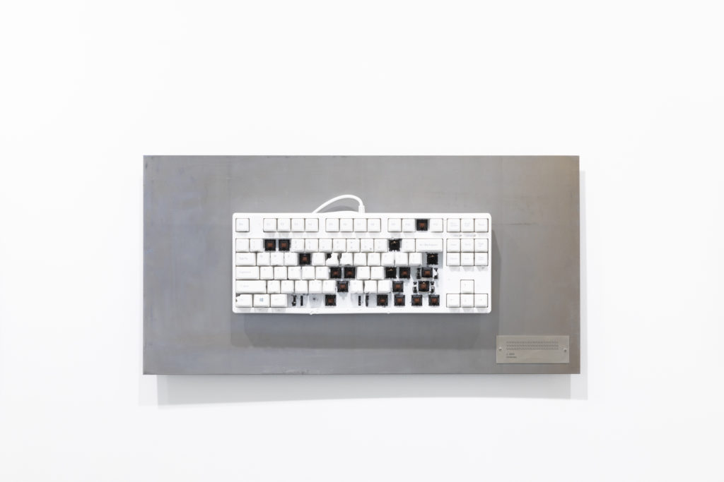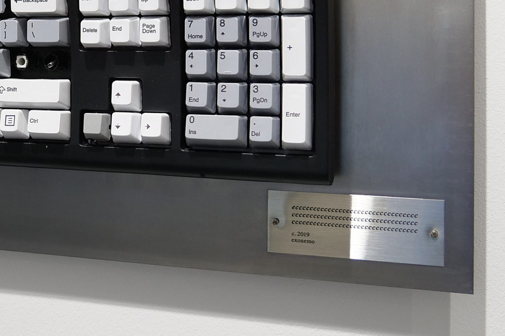 This series consists of computer keyboards that have been fired at with a shotgun. Each keyboard bears a title – whatever sequence of keys was entered by the pellets upon impact – which is engraved on a metal plate, while footage documenting the process plays next to the keyboards. The term “shotgun texting” is internet slang for sending the same message to a large number of people simultaneously. The idea also draws inspiration from William Burroughs’ “shotgun art,” in which he shot spray paint cans to create paintings. The work might be said to be a contemporary take on the proverb “The pen is mightier than the sword,” and is very much a product of exonemo’s current working environment: the United States.