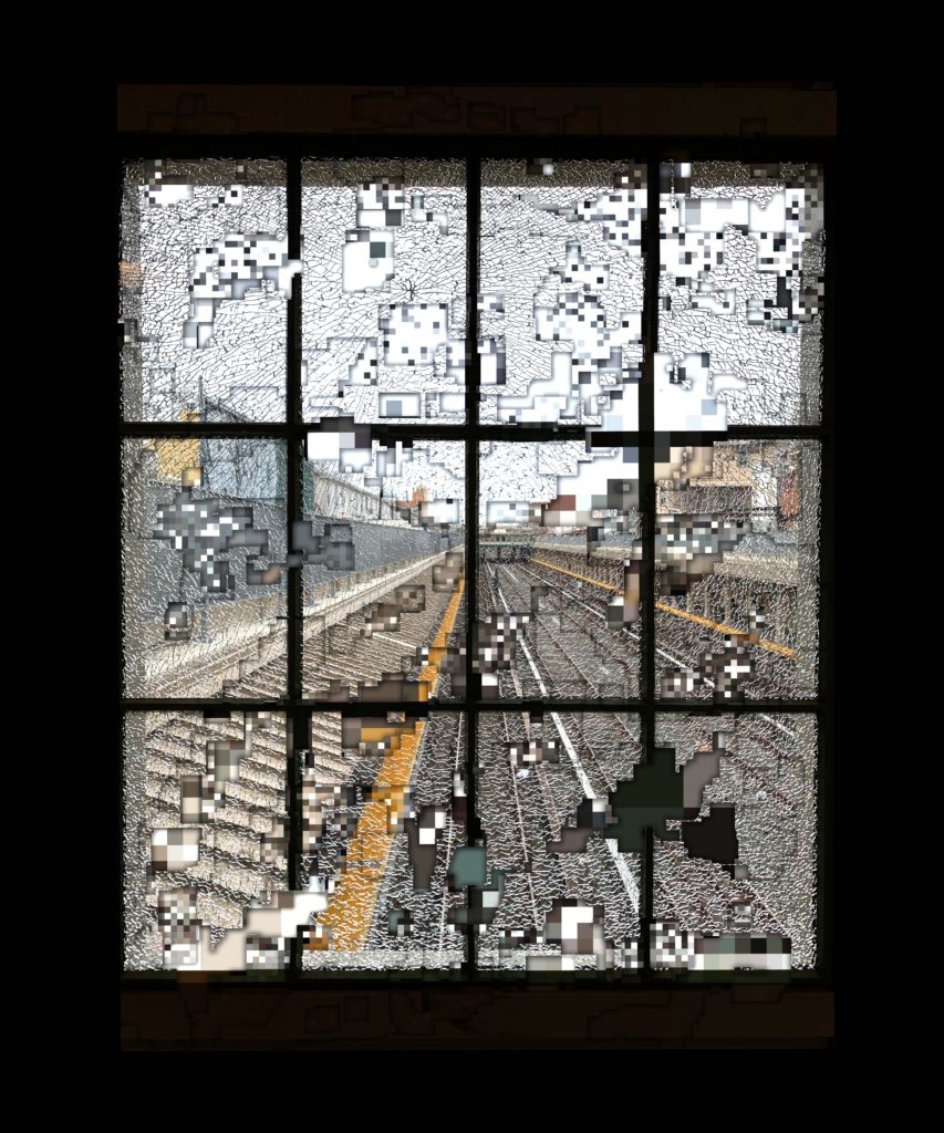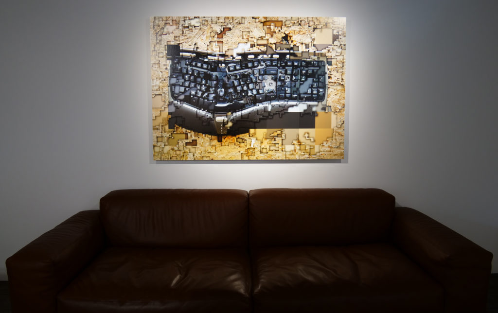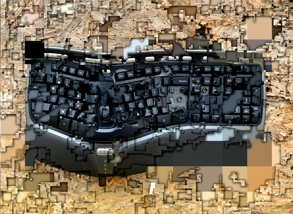 This is a graphic piece created using an originally developed software. When an image is inputted, five layers are generated, with higher resolution in the front and lower resolution in the back, and the graphics are created by "scraping" the layers. The scraping process was done as if drawing with a pen tablet. This is an attempt to expand the cut-up method to the inter-pixel and inter-resolution space and reveal what is hidden behind digital images. The three works created for the solo exhibition "Slice of the universe" (MAKI Gallery, Tokyo) in 2020 were chosen based on the theme of "a destroyed interface." Each was processed from the original images of " the mouse videoed for DanmatsuMouse," "the keyboard videoed for Shotgun Texting," and " a cracked windowpane found in a train station in Brooklyn."