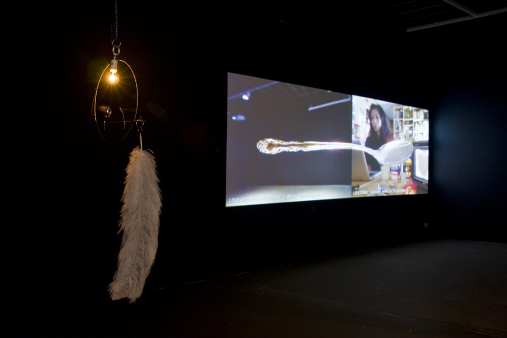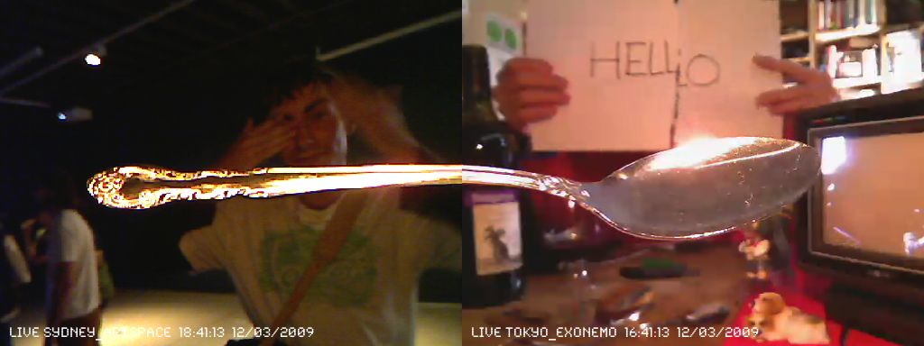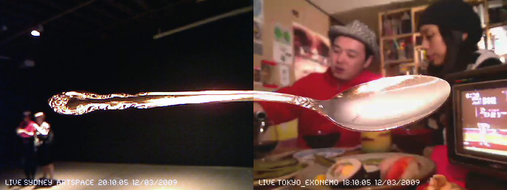 Supernatural connects a spoon, which has been divided as if by psychic powers (à la Uri Geller), by placing one half at the venue and the other at the artist’s home, and live streaming them side-by-side. Like the two pieces of the spoon, the two remote locations are reconnected using media technology in a “seemingly natural, probably supernatural” manner.