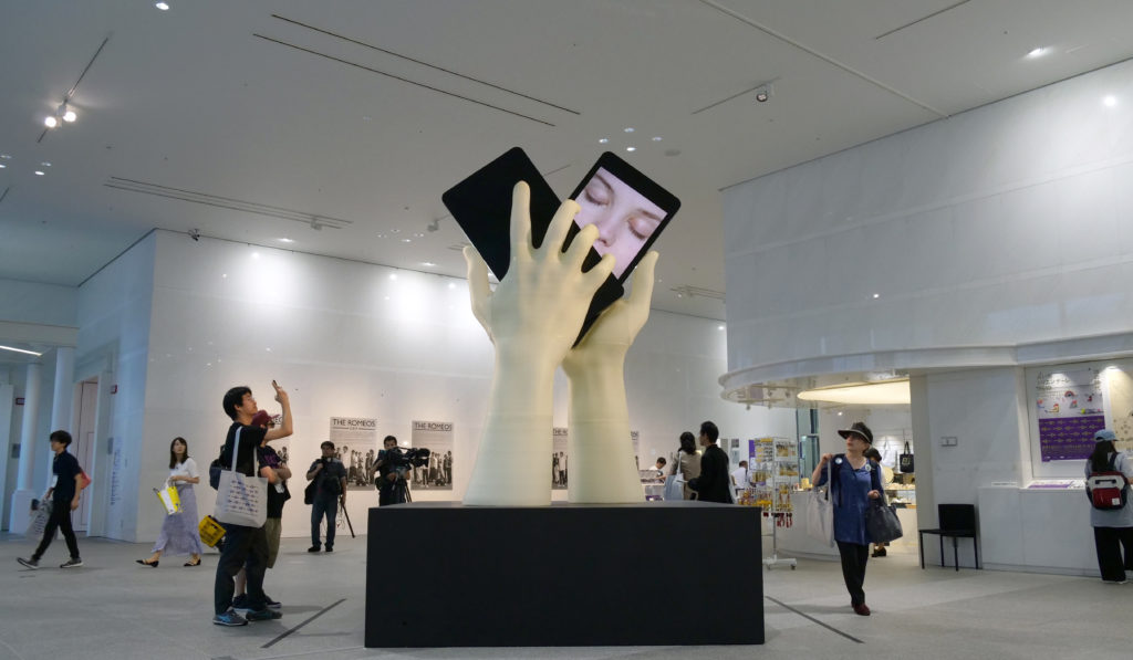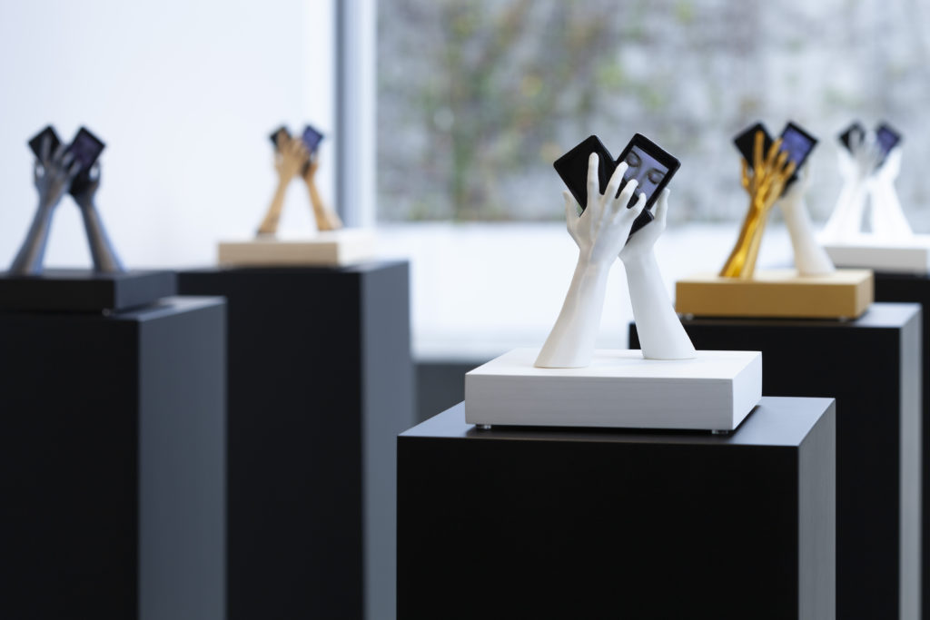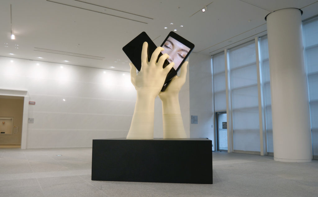 Smartphones have become ubiquitous over recent years, and many of us now hold these devices in our hands as though they were an extension of our bodies. The vast information that floods through their modest screens have the power to rock our emotions, creating new encounters, misunderstandings, divides. exonemo produced this work – commissioned for Aichi Triennale 2019: Taming Y/Our Passion – departing from the question of what a monument symbolizing such an age might look like. Though the sculpture of two large hands recalls the didactic monuments of socialist regimes, these hands hold up screens that each display a face, pressed against one another as though engaged in a kiss. In reality, however, these are just two separately taken photographs of people with their eyes closed. The sculpture’s hand parts have been created by 3-D printing, a technology that allows for easy reproduction, enlargement, and reduction. This lends the sculpture a certain lightness unseen in ideological monuments, rendering the artwork’s message more uncertain and abstract.